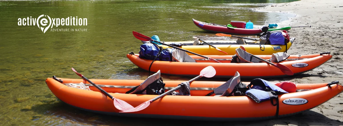 Kayaking Gear.- Inflatables expedition kayaks, lifejackts and paddles